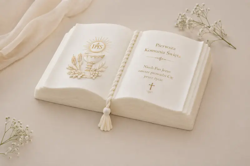 Rant cukierniczy w kształcie otwartej księgi idealny do wykonania toru z okazji I Komunii Świętej oraz innych okoliczności.
